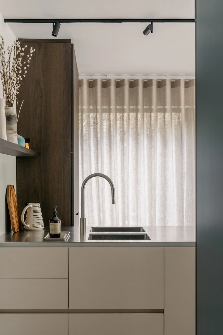 Door het strategisch wegnemen van tussenmuren en het vergroten van reeds bestaande ramen wordt de lichtinval gemaximaliseerd en krijgt de woonst een open en verwelkomend gevoel. De terracotta vloer vormt de basis van het materialenpalet, ondersteund door beige en blauwe tinten.
