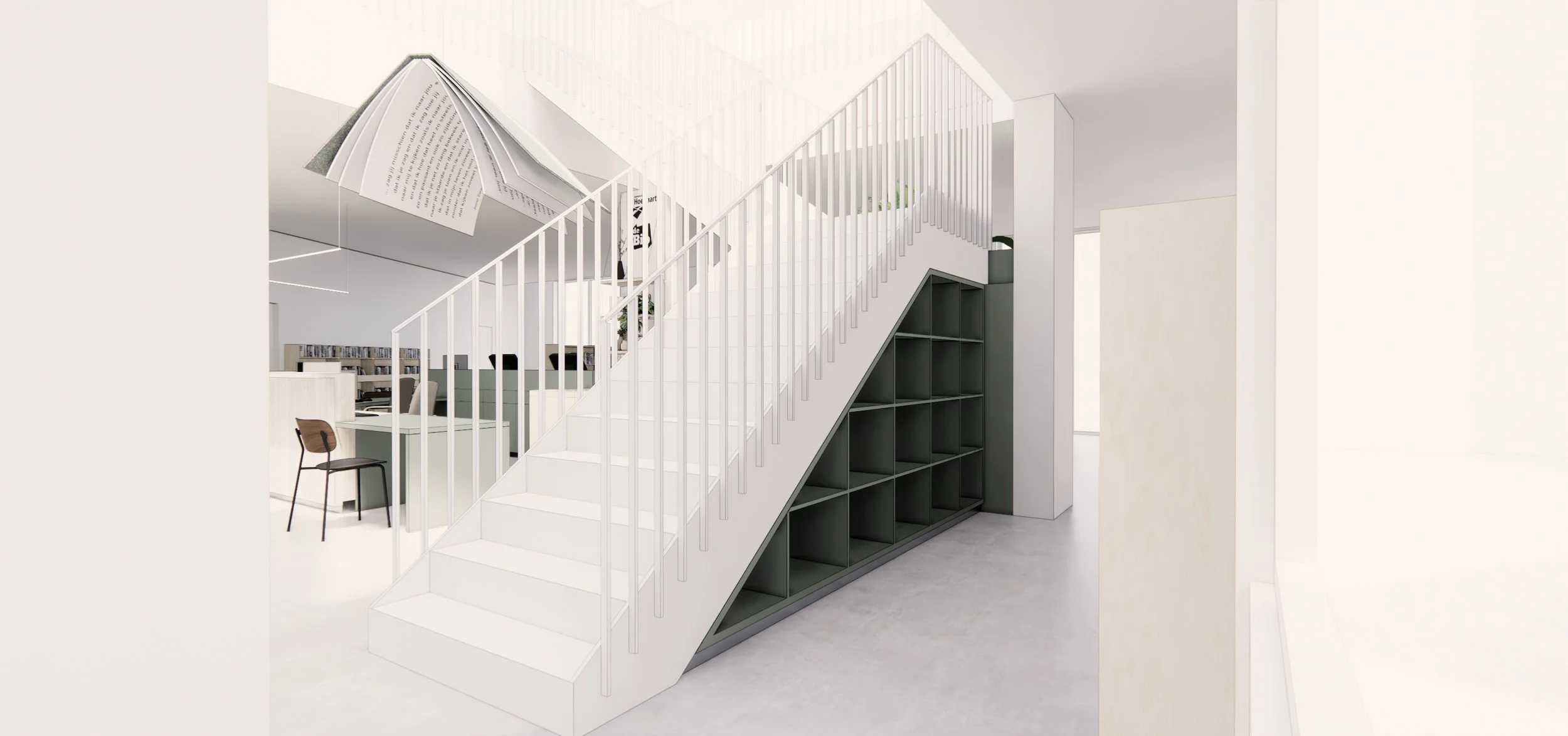 Voor de bib van Hoeilaart werd een statement in de traphal ontworpen: 3 enorme boeken, opgehangen tussen een aantal lichtbollen. Een fantasierijke toets die van de ruimte meer maakt dan een doorsnee bibliotheek.